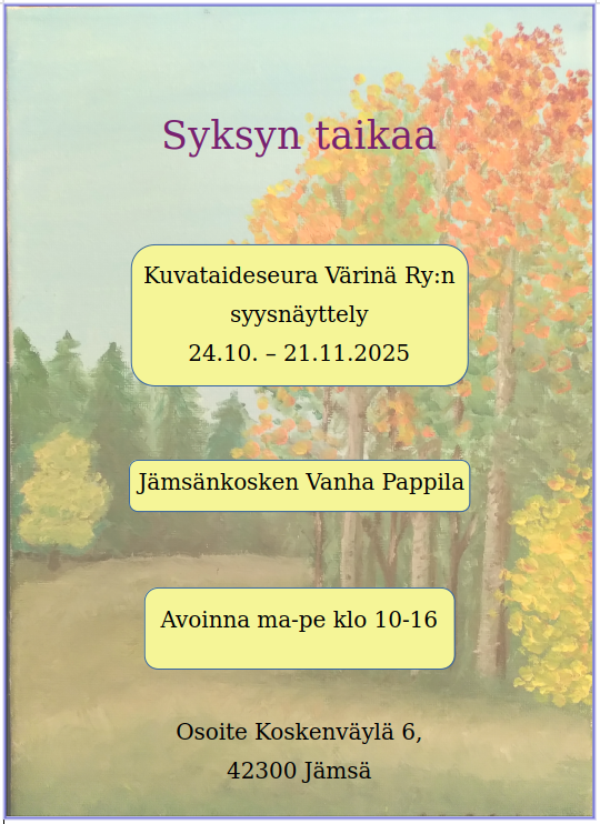 Värinän jäsenenä saat taiteellisen yhteisön ympärillesi! Saat säännöllisesti sähköpostiisi tietoa tulevista tapahtumista, näyttelyista, reissuista ja jäsenalennuksista. Jäsenenä pääset edullisemmin mukaan kursseille ja retkille ja voit tarjota taidettasi jäsenten näyttelyihin.